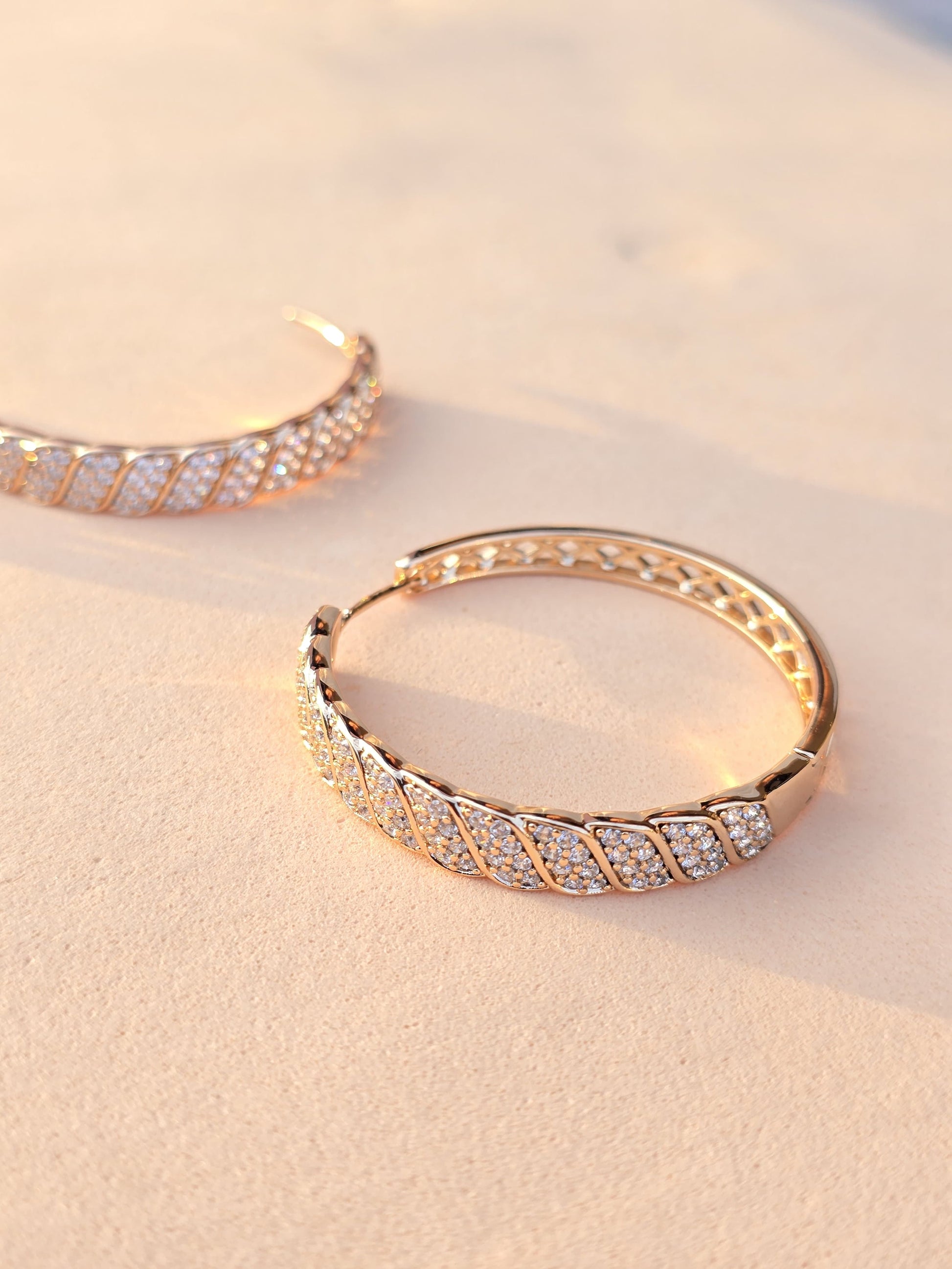 La Candonga Lumière combina el brillo del lujo con la sutileza del diseño moderno. Elaborada en aleación de cobre con baño en oro rosa 18K, presenta un acabado pulido y circones incrustados que reflejan la luz con cada movimiento.