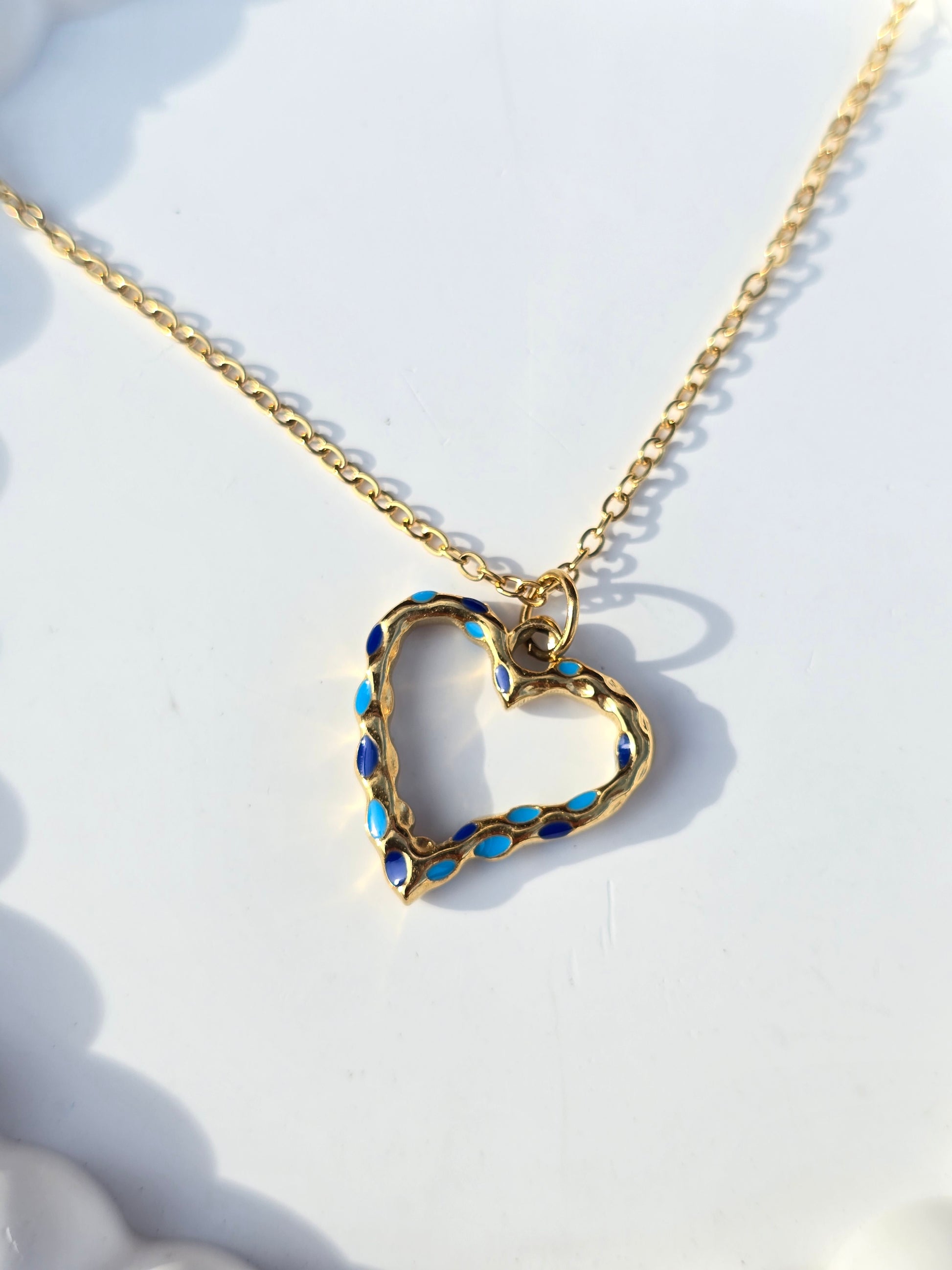 Luce un estilo romántico y sofisticado con esta encantadora cadena con dije de corazón azul, elaborada en acero inoxidable dorado de alta calidad. Su combinación de tonos dorados y azules crea un contraste elegante que refleja frescura, amor y confianza. Ideal para mujeres que aman los accesorios modernos, delicados y con significado, perfectos para realzar cualquier look con un toque único. Su material es resistente al agua, no se oxida y conserva su brillo impecable.