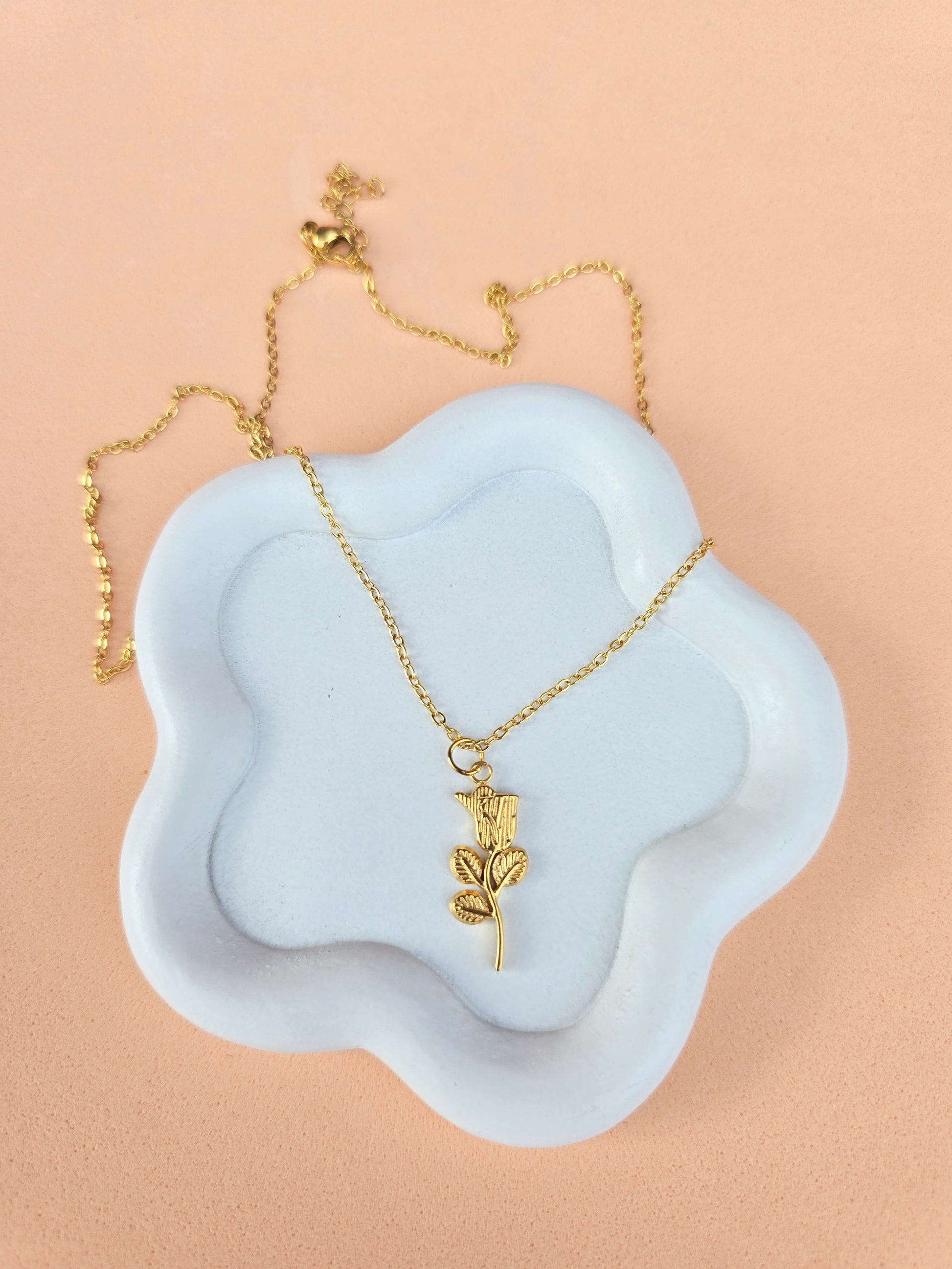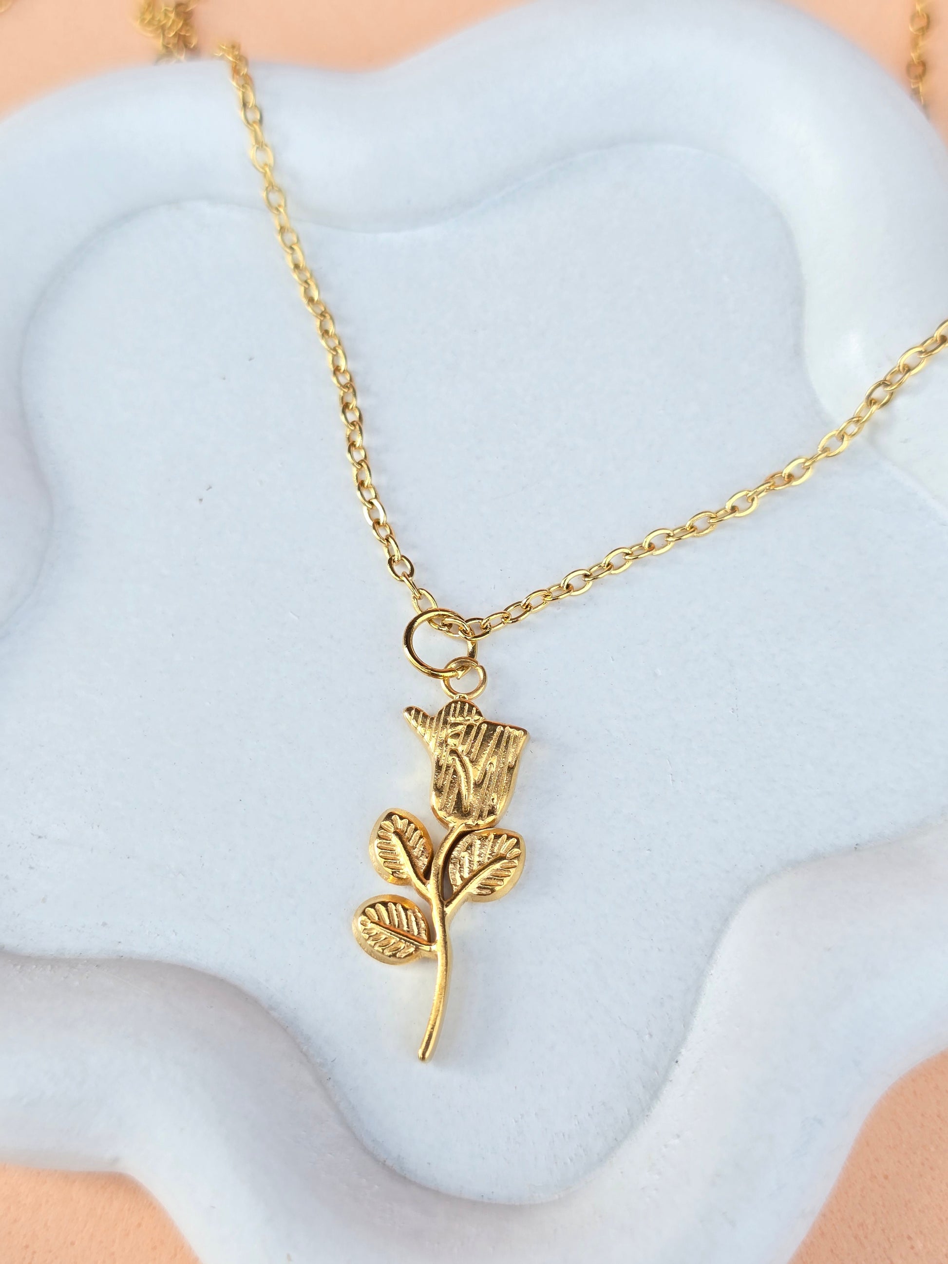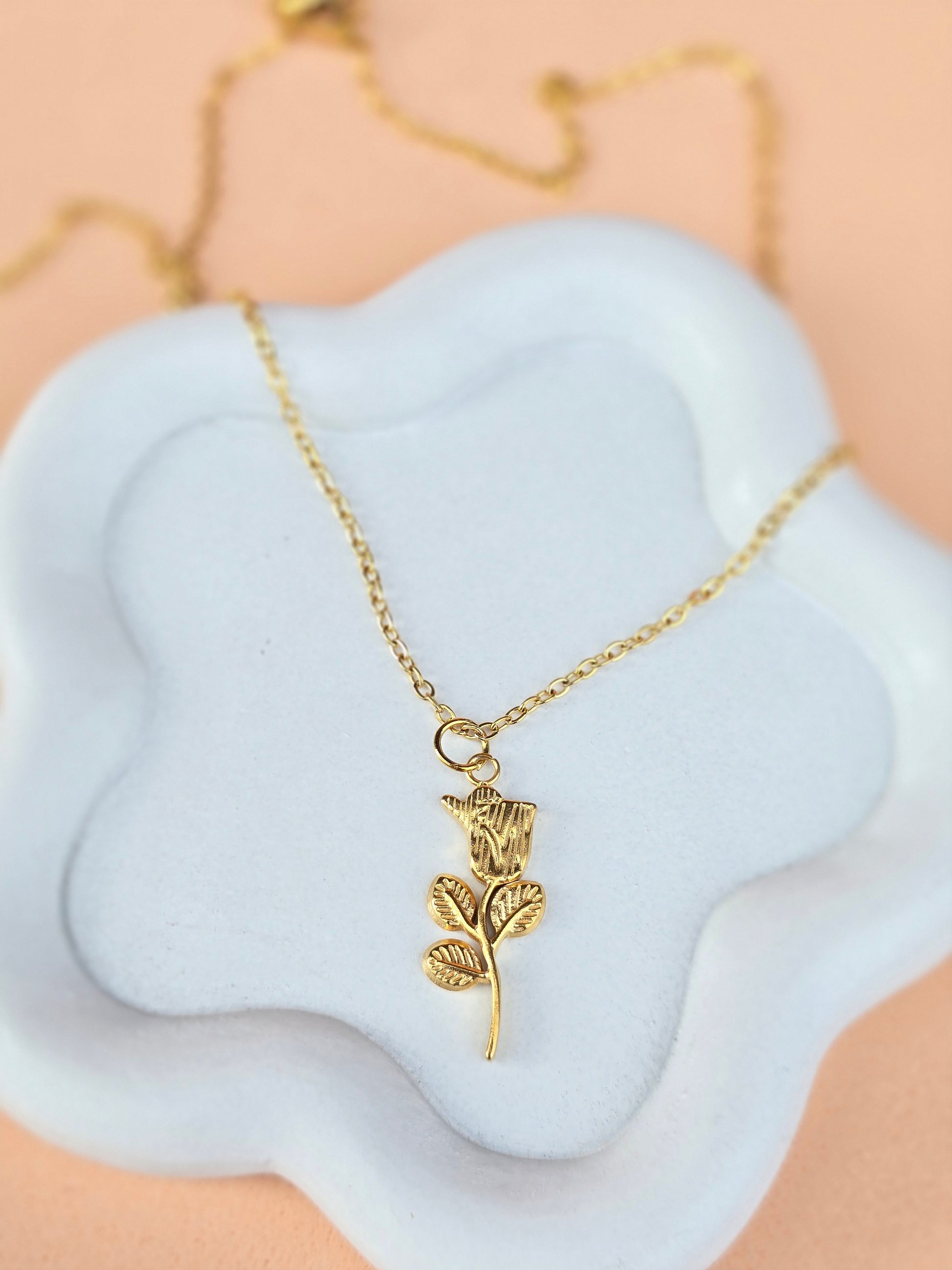 Ilumina tu look con esta cadena con dije de rosa, elaborada en acero inoxidable dorado de alta calidad, resistente al agua y al desgaste.
