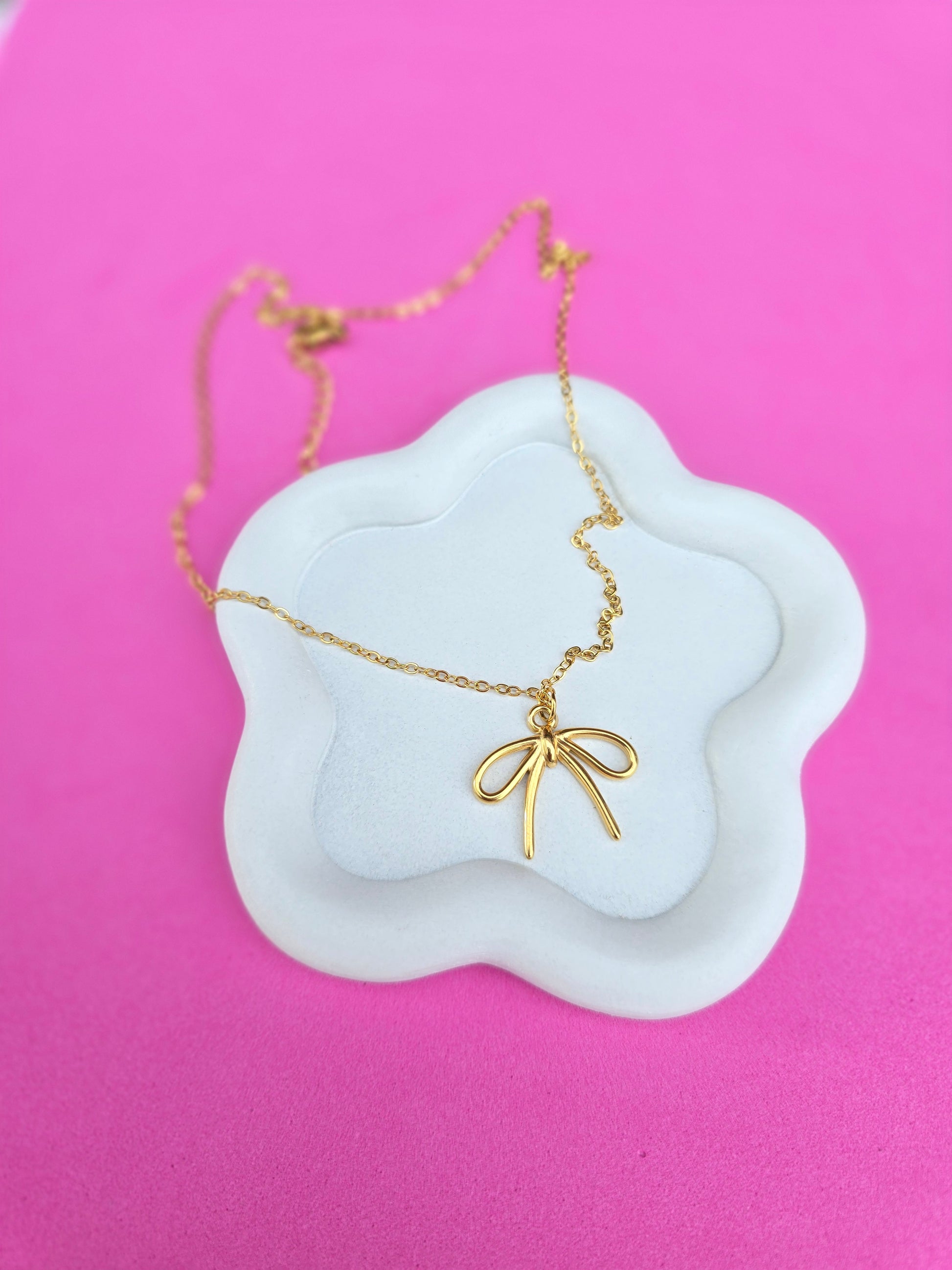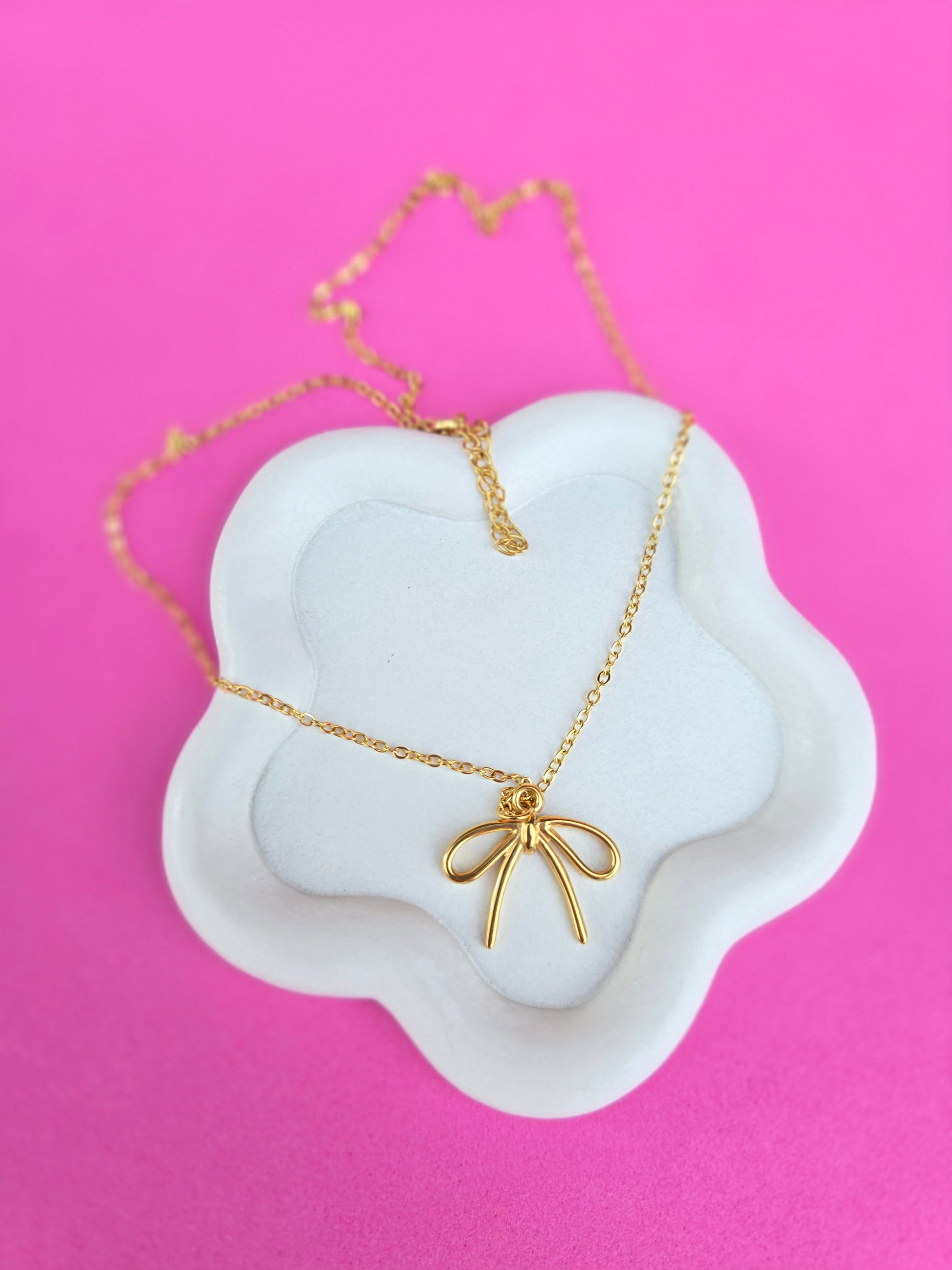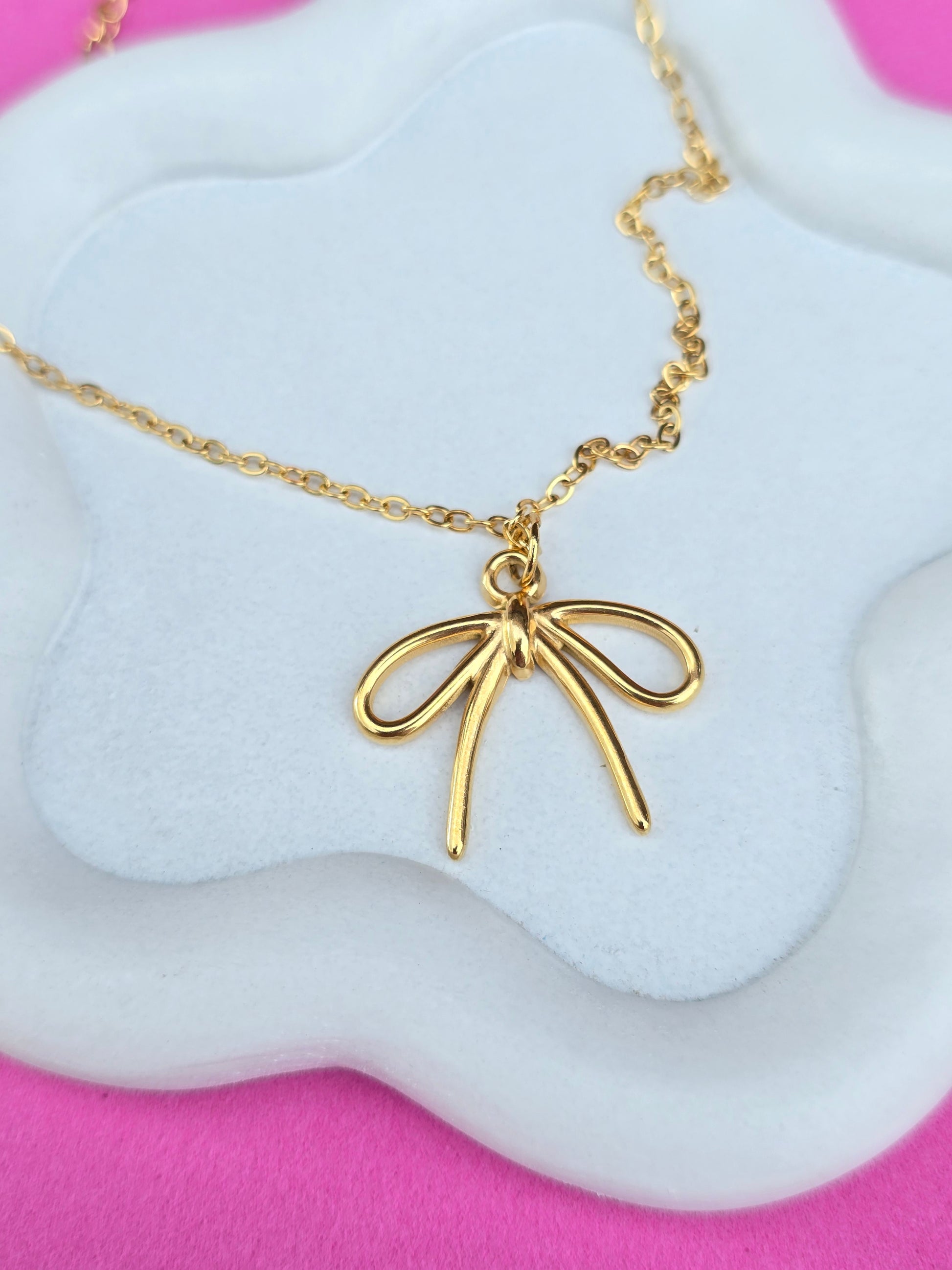 Luce tu lado más dulce y femenino con esta encantadora cadena con dije de lazo, inspirada en la tendencia coquette. Fabricada en acero inoxidable dorado de alta calidad, es resistente al agua, no se oxida y mantiene su brillo impecable con el paso del tiempo. Su diseño delicado y romántico la convierte en el accesorio perfecto para realzar tus looks diarios o dar un toque elegante a tus outfits más especiales.